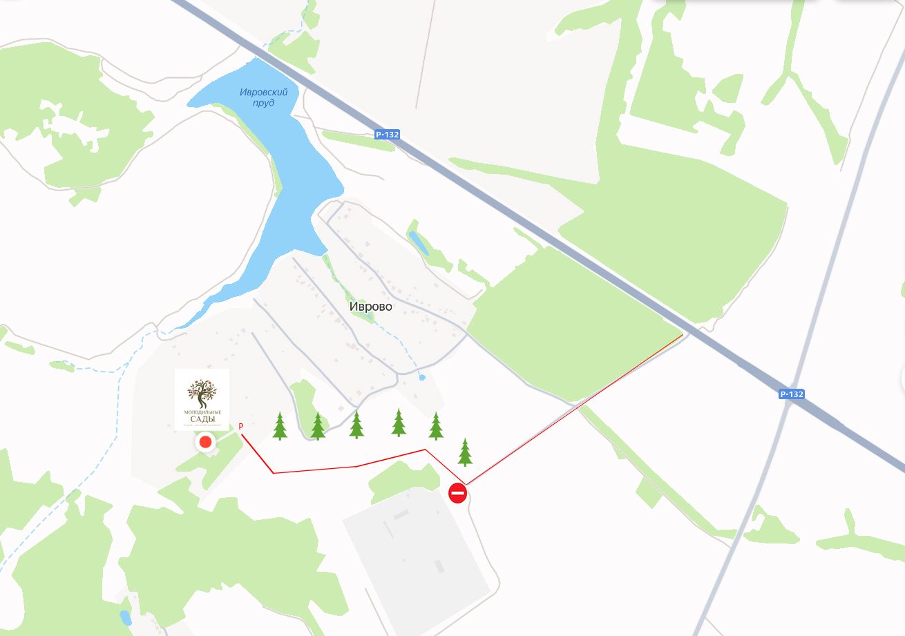 На карте показан маршрут к базе отдыха: Съезжаете с трассы р132 на д.Иврово, держите путь прямо, до знака «Въезд запрещен» (кирпич) и поворачивайте направо. Далее двигайтесь вдоль ёлочек до шлагбаума — это наш въезд.